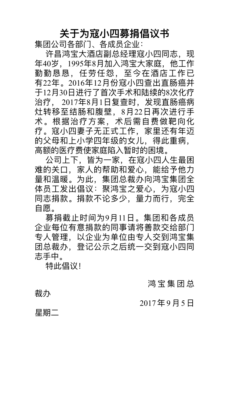 一人有難,八方支援。在得知寇小四同志的困難情況后,鴻寶集團發出“為寇小四募捐倡議書”的號召。
