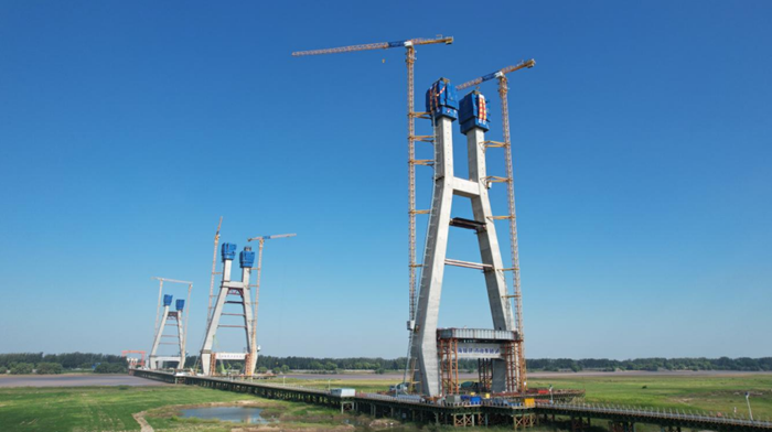 蘭封高速東壩頭黃河大橋主橋全長9104米,主橋采用主跨140+360+360+140米的鋼混組合梁三塔斜拉橋設(shè)計,塔柱外形為中原鼎型結(jié)構(gòu),主橋中塔89#墩高達160.5米,分27個節(jié)段進行澆筑;兩座邊塔88#墩、90#墩均為154.3米,分26個節(jié)段進行澆筑。歷經(jīng)12個月的日夜奮戰(zhàn),蘭封高速黃河大橋88#墩主塔26個節(jié)段的施工任務提前兩個月完成。